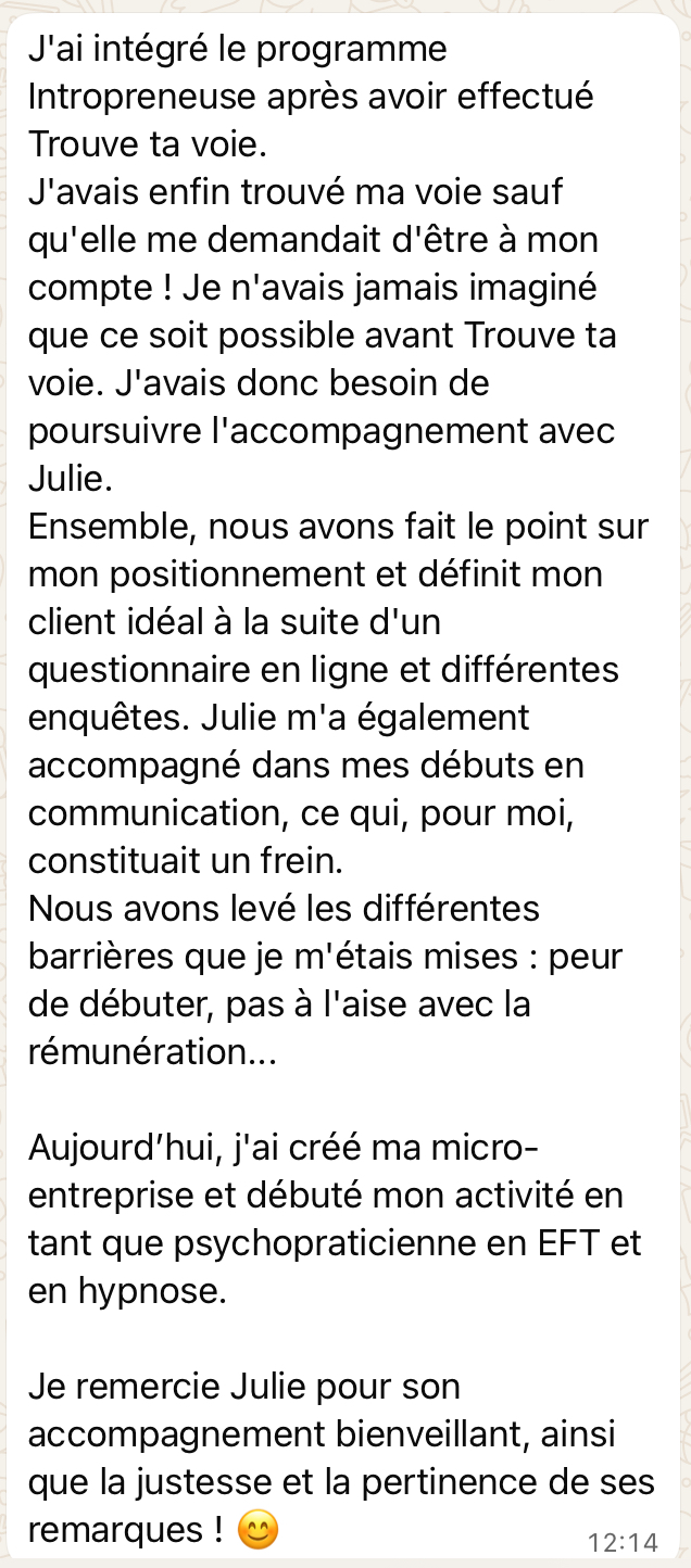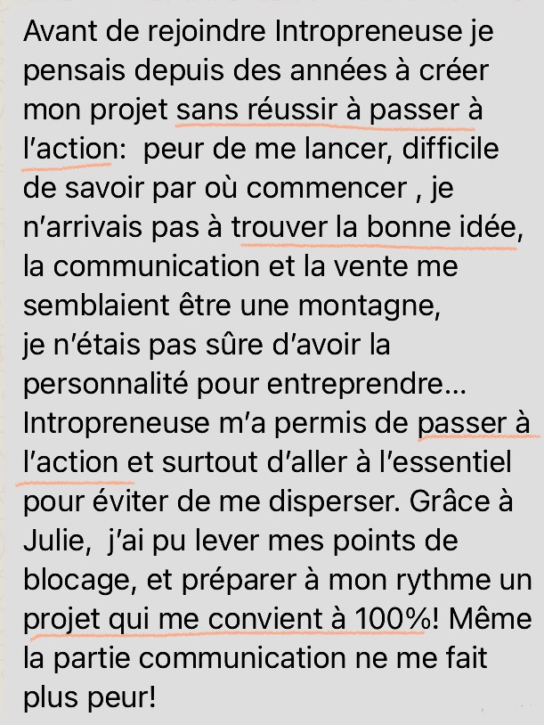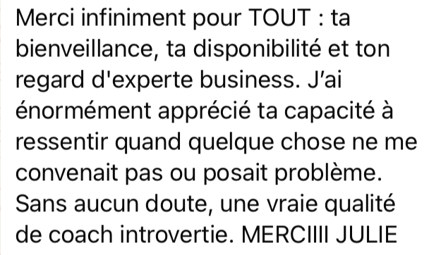 2021 : Je décide de me lancer quand même, en parallèle de mon emploi. Après des mois de recherche je trouve enfin mon idée rentable : je veux accompagner les introverties à construire une carrière qui leur ressemble. Quelques mois plus tard, je vends mes premiers accompagnements !