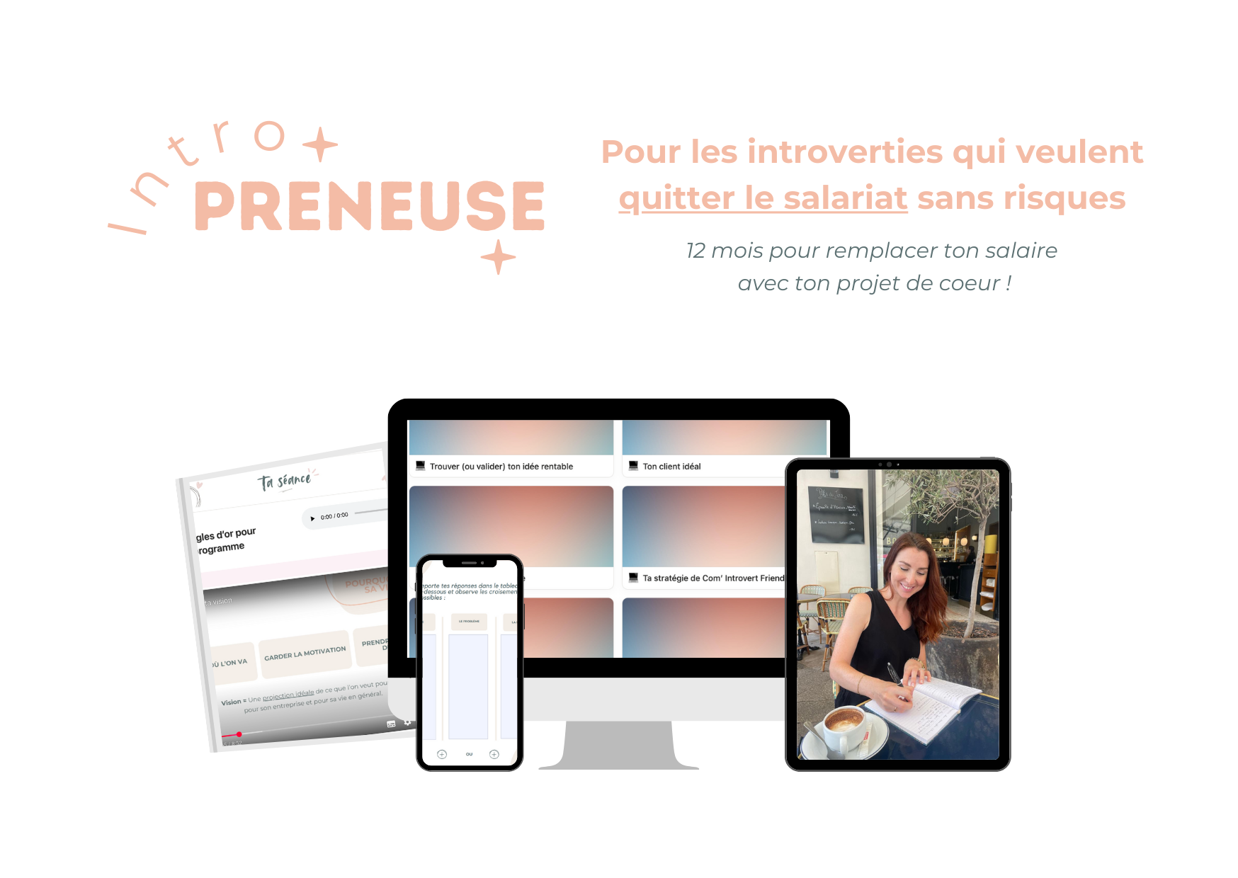 Intropreneuse t’apprend à développer ton activité en parallèle de ton emploi. On travaille aussi ton plan de transition financière pour que tu aies un matelas de sécurité pour te lancer sereinement.